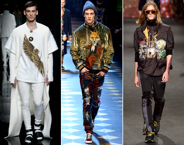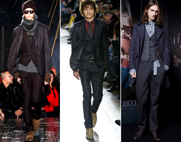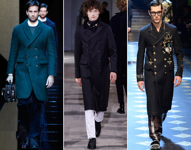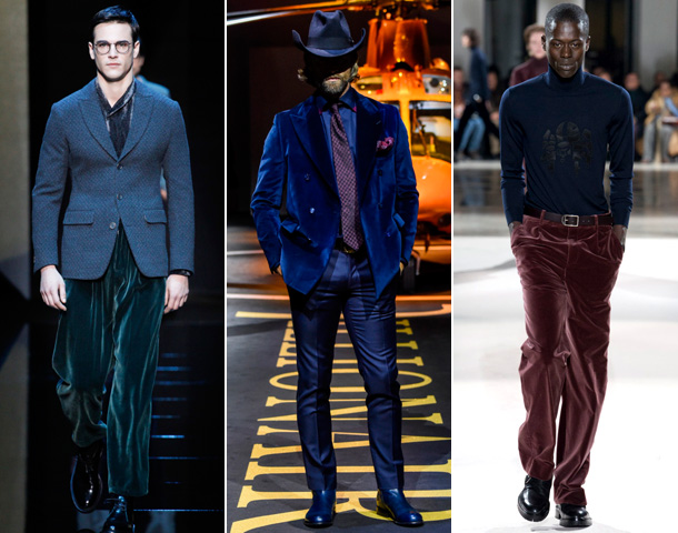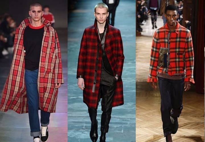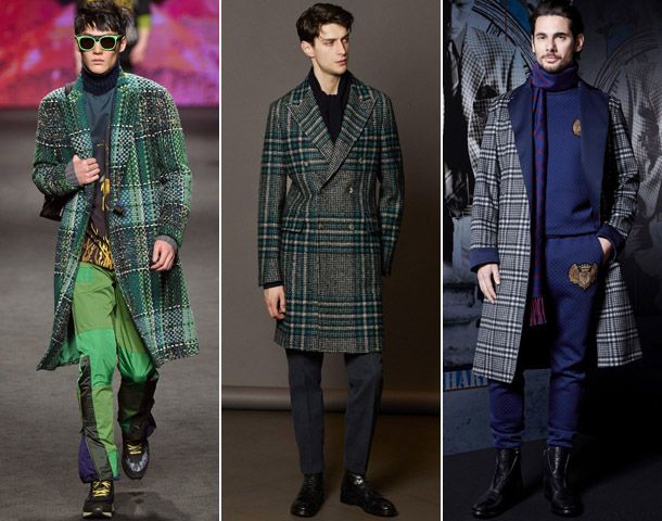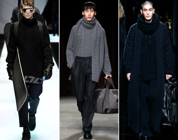 удобные и уютные вещи, вязаные фактуры – на верхушке модного олимпа. Джемперы и свитера, уютные шерстяные пальто и кардиганы-оверсайз, удлиненные модели свитеров «с чужого плеча» и традиционные для мужской моды водолазки, объемные снуды и длинные шарфы – все это отлично подойдет для прохладных дней. Предпочтение отдается крупной вязке, объемным фактурным косам. V-образные вырезы сдали свои позиции и уступили место высоким воротникам и небольшим вырезам у самого горла. Актуальные цвета – практически все оттенки синего, традиционный коричневый, серый, черный, также в моде мягкие оттенки хаки, лайма и горчицы. Актуальны вкрапления цветовых акцентов на приглушенном фоне.
