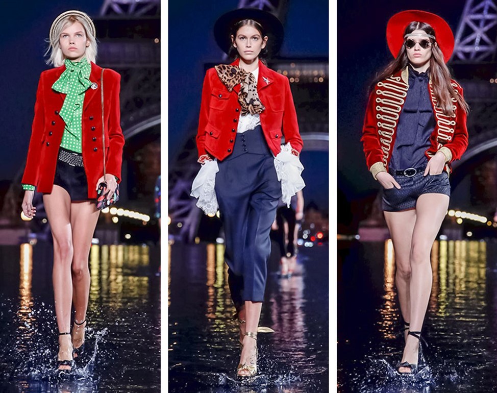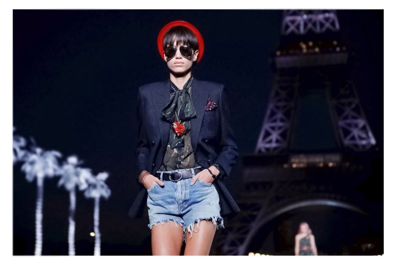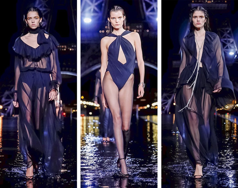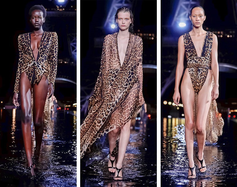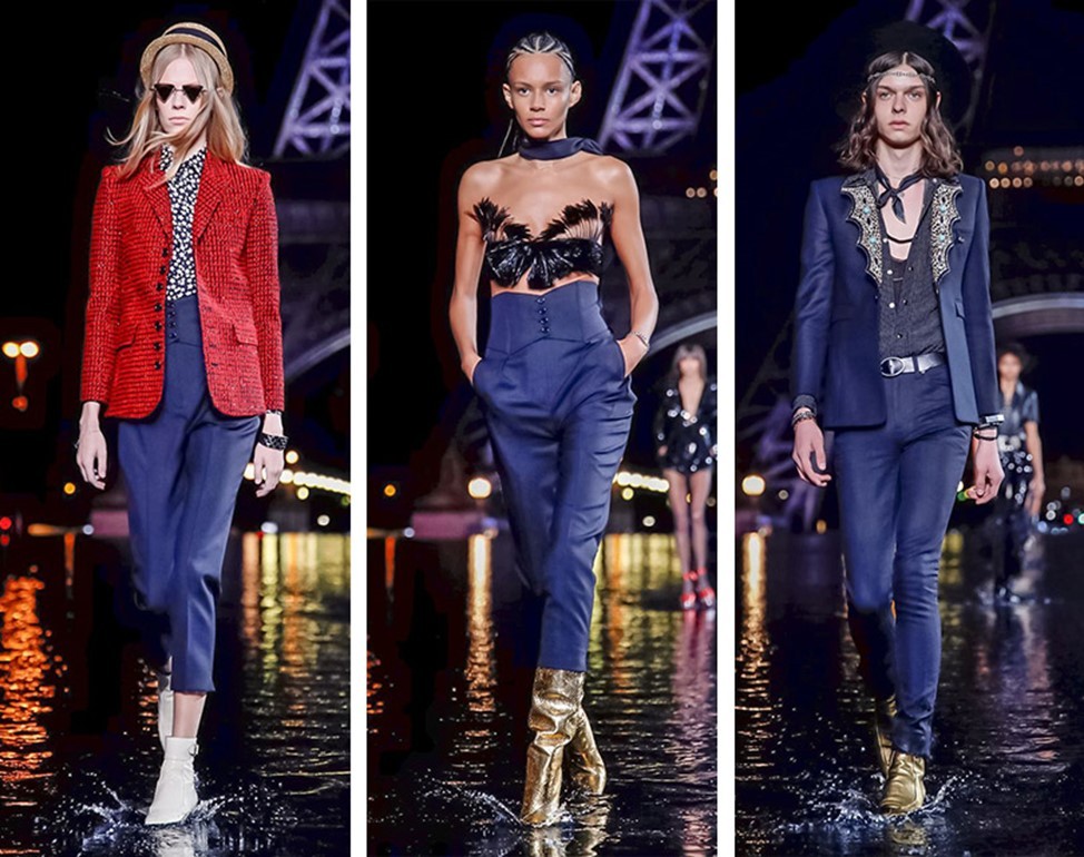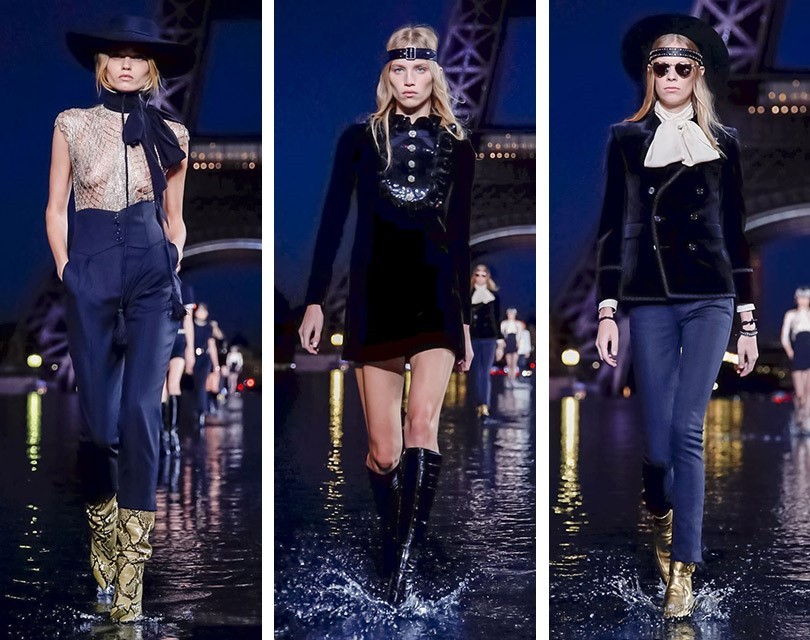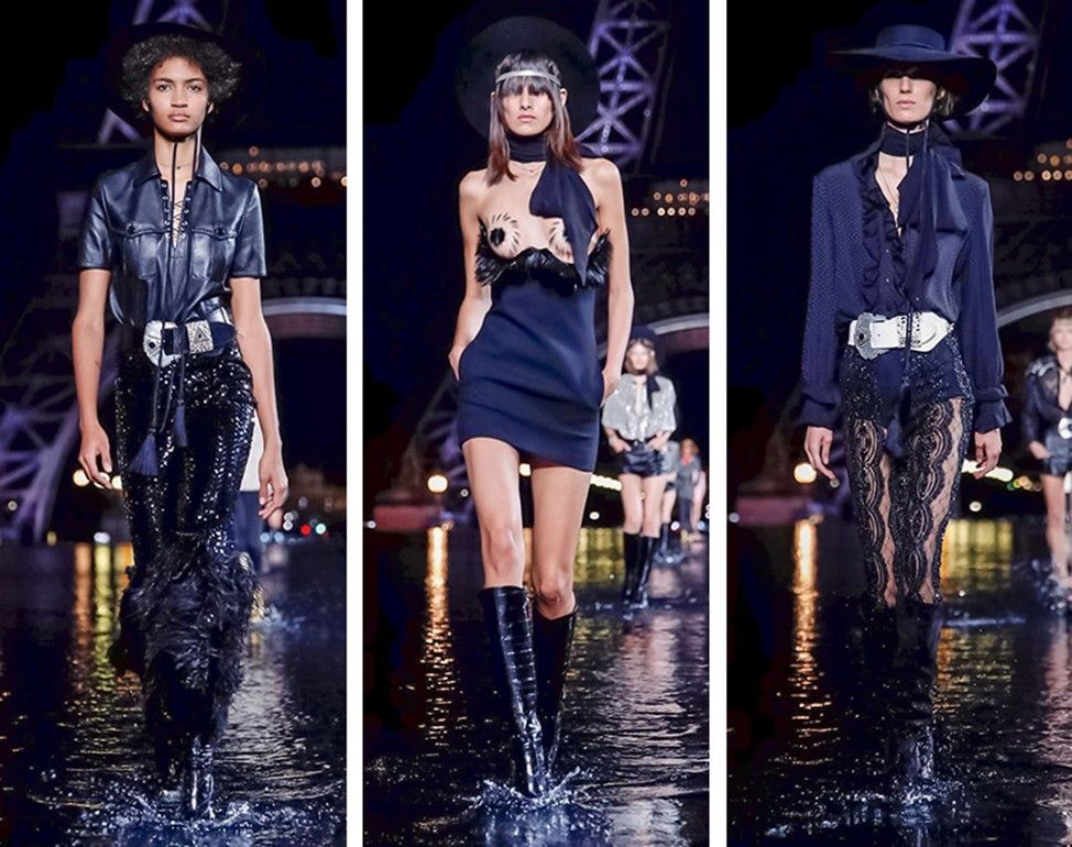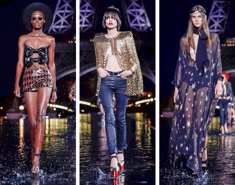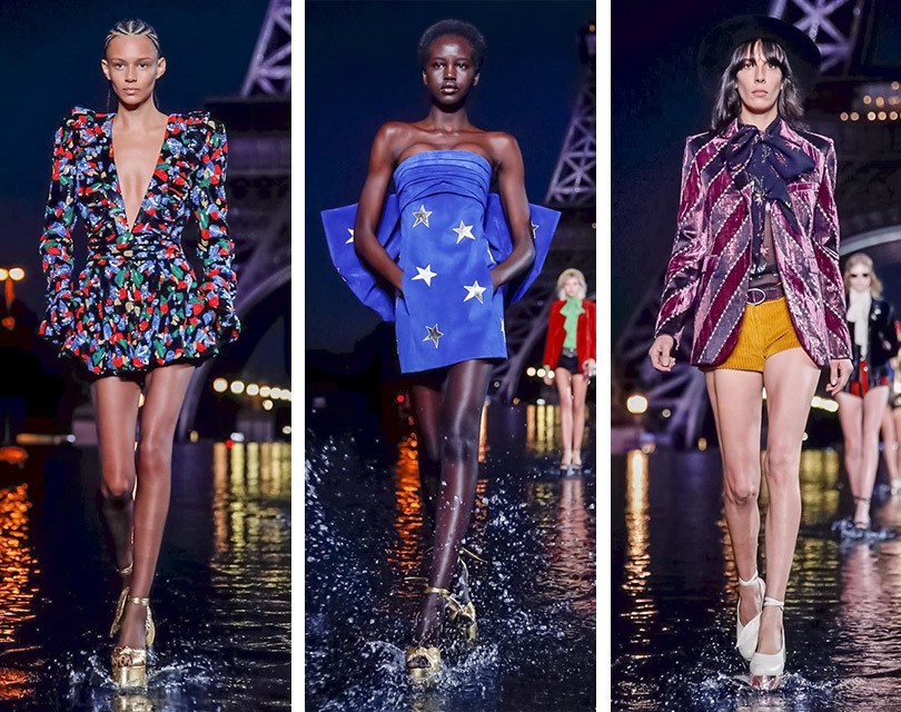 Показ коллекции Saint Laurent сезона весна-лето 2019 прошел во вторник, 25 сентября в Париже. Fashion-сцена была действительно великолепна. Креативный директор Saint Laurent превратил подиум в огромный бассейн, около 8-ми сантиметров глубиной. Как только стемнело началось световое шоу. Первая модель эффектно появилась ровно в 8 часов вечера. Модели дефилировали на фоне Эйфелевой башни по щиколотку в воде. Десять стилизованных белых пальм выстроились по одну сторону подиума и эффектно отражались в черной водной глади обширного бассейна. По другую сторону бассейна зрители заняли свои места в амфитеатре длиной в сотню метров.