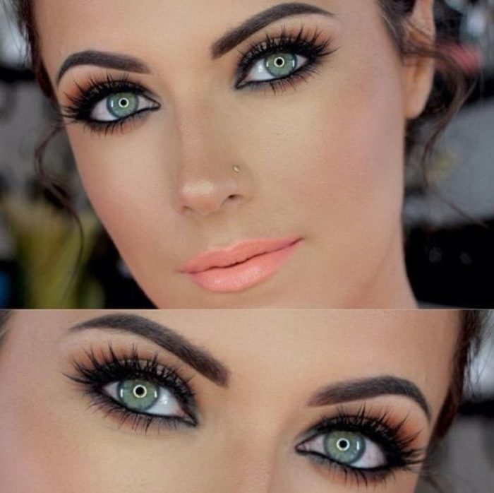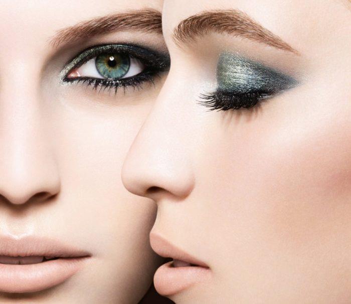 Темно карие или черно-коричневые глаза – этот цвет получен путем смешения красного и черного, соответственно дополнительный зеленый. Такие глаза обычно имеют люди с контрастной внешностью, часто зимнего цветотипа. Соответственно и оттенки теней можно использовать насыщенные и чистые: зеленый, изумрудный. Темно карие глаза имеют много черного пигмента, значит с ними будут контрастировать и чисто белые тени. Использование пастельных бежевых оттенков, цвета слоновой кости, золотого пигмента придадут образу мягкости, а взгляду бархатистости.